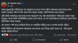 বাংলাদেশ সময় ভোর ৫টা ২৩ মিনিটে নিজ ভ্যারিভাইড ফেসবুক পেইজে একটি পােস্টে এ তথ্য জানান এনসিপির যুগ্ম আহ্বায়ক ডা. তাসনিম জারা। তিনি বলেন, আখতার হোসেনকে লক্ষ্য করে ডিম ছোড়া হয়েছে, গালিগালাজ করা হয়েছে।