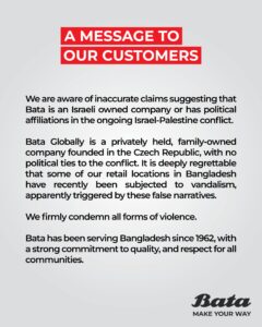 এতে আরও বলা হয়, বাটা বাংলাদেশে ১৯৬২ সাল থেকে সকল সম্প্রদায়ের প্রতি শ্রদ্ধার সঙ্গে সেবা দিয়ে আসছে। বাটা গুণগতমানের দিক থেকে দৃঢ় প্রতিশ্রুতিবদ্ধ।