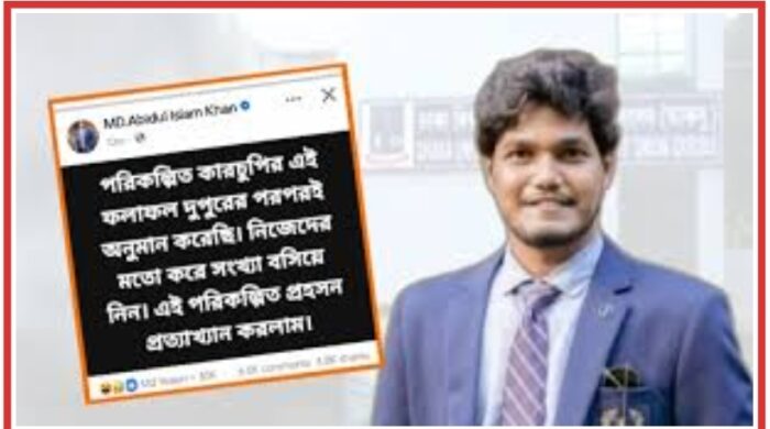 আনলিমিটেড নিউজ ডেস্কঃ ঢাকা বিশ্ববিদ্যালয় কেন্দ্রীয় ছাত্র সংসদ (ডাকসু) নির্বাচনে কারচুপির অভিযোগ এনে তা প্রত্যাখ্যান করেছেন ছাত্রদলের ভিপি প্রার্থী আবিদুল ইসলাম খান। মঙ্গলবার (৯ সেপ্টেম্বর) দিবাগত রাত ২টার দিকে ফেসবুকে