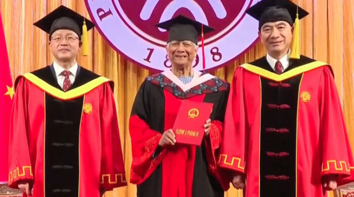 আনলিমিটেড নিউজ ডেস্কঃ চীনের পিকিং বিশ্ববিদ্যালয় থেকে সম্মানসূচক ডক্টরেট ডিগ্রি দেওয়া হয়েছে অন্তর্বর্তী সরকারের প্রধান উপদেষ্টা অধ্যাপক মুহাম্মদ ইউনূসকে। শনিবার (২৯ মার্চ) সকালে বিশ্ববিদ্যালয়ের কনফারেন্স হলে আয়োজিত এক অনুষ্ঠানে পিকেইউ